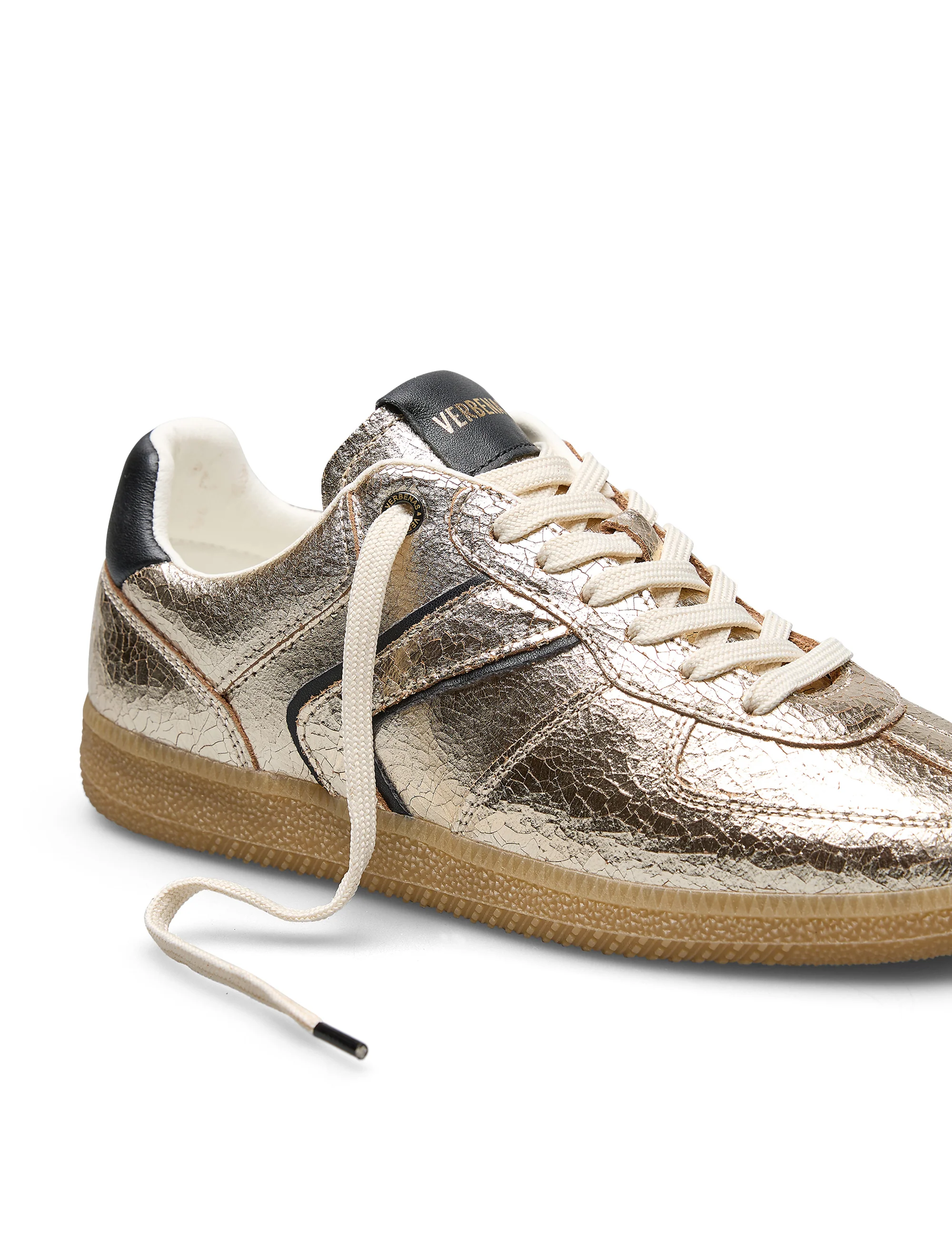 Sneakers Sora Breck en color Oro. Confeccionadas con piel laminada con acabado metalizado y efecto craqueado. Cuentan con forro interior acolchado para mayor confort,planta transpirable, flexible y confortable que absorve la pisada y suela de caucho natural.