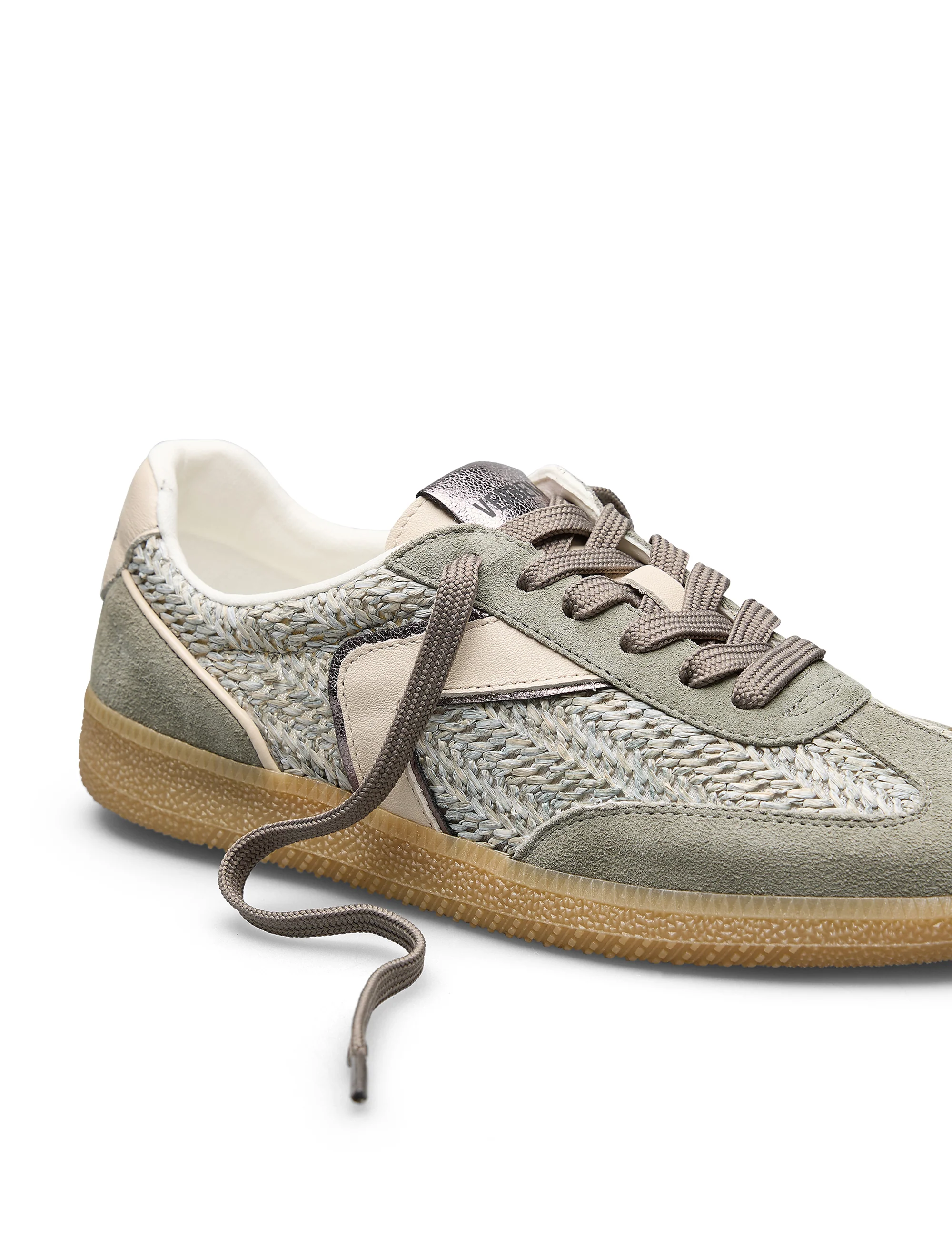 Sneakers Sound Tropic Bosco. Confeccionadas con combinado de serraje suave y paneles trenzados en color verde que aportan textura, ligereza y un look artesanal. Cuentan con un forro interior acolchado, planta transpirable, flexible y confortable que absorve la pisada y suela de caucho natural.