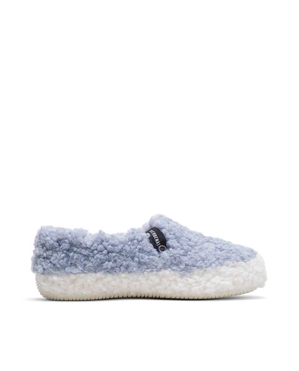 Zapatillas de casa Yecla Curly en color Cielo/Crudo. Confeccionadas con corte 100% PES, forro y planta 100% PES y suela 100% de caucho. Fabricadas en España. Destaca su parte exterior con borrego largo rizado y su forro de pelo en su interior.